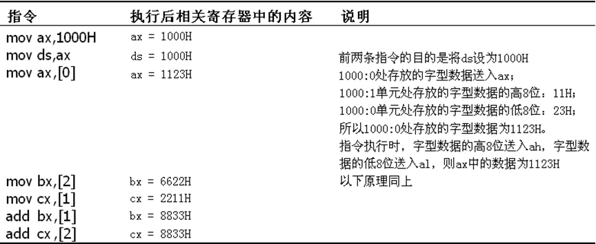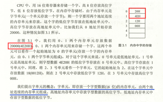 这段话的主要意思是:一个字=2b=16bit,cpu中是用两个内存单元储存一个字(假如获取0地址存放的字型数据,就是获取它的高位字节0 1位和低位字节0位的数据,数据由高地址位向低地址位读)