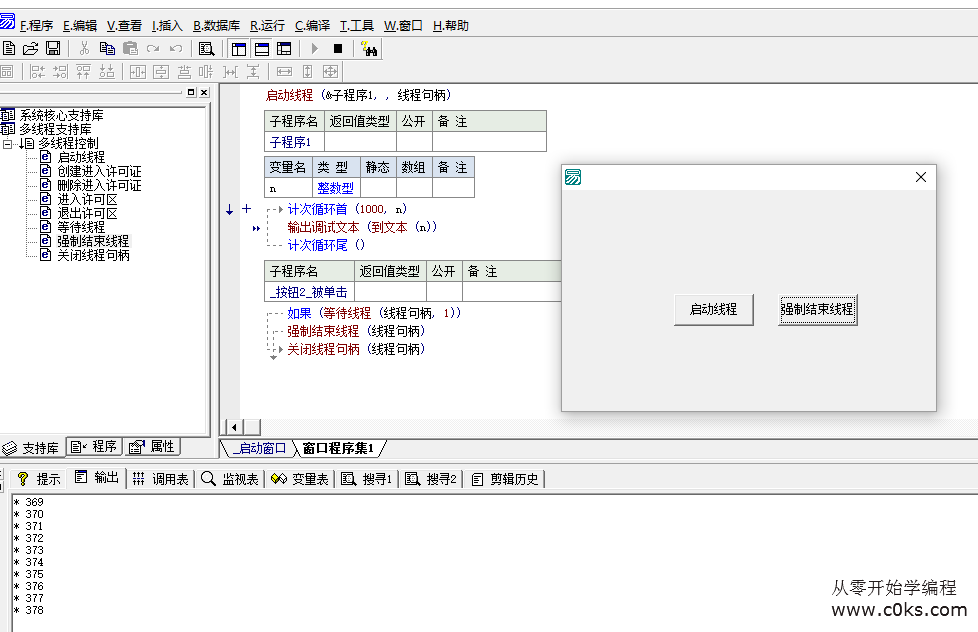 .版本 2 .支持库 ethread .程序集 窗口程序集1 .程序集变量 线程句柄, 整数型 .子程序 _按钮1_被单击 启动线程 (&子程序1, , 线程句柄) .子程序 子程序1 .局部变量 n, 整数型 .计次循环首 (1000, n) 输出调试文本 (到文本 (n)) .计次循环尾 () .子程序 _按钮2_被单击 .如果 (等待线程 (线程句柄, 1)) 强制结束线程 (线程句柄) .否则 关闭线程句柄 (线程句柄) .如果结束