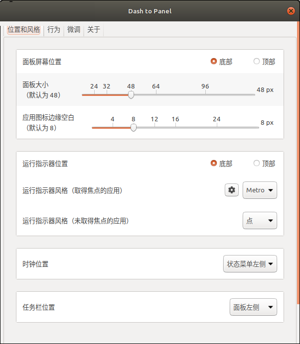 通过以下窗口,您可以更改时钟的位置,面板的位置,面板的大小和图标边距等等: