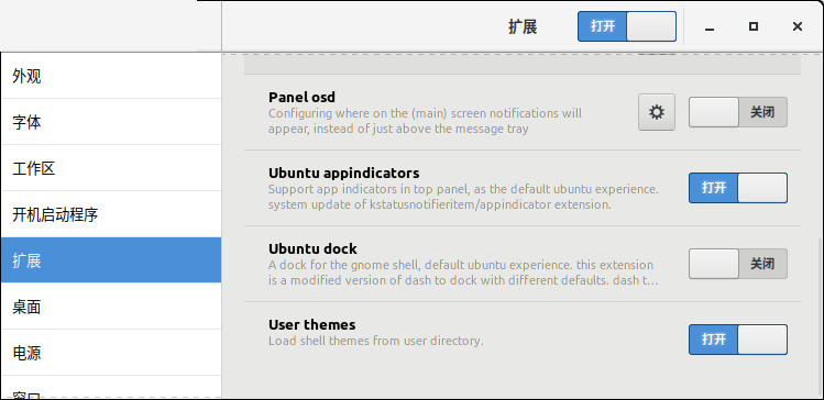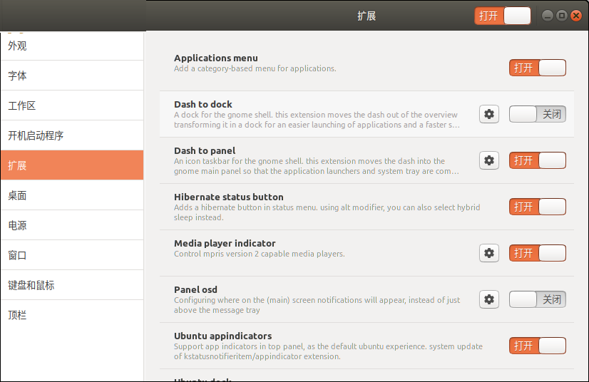 如果您想在ubuntu系统中使用相同类型的菜单,可以通过tweaks工具完成。移至extensions面板,然后按如下所示打开applications menu按钮: